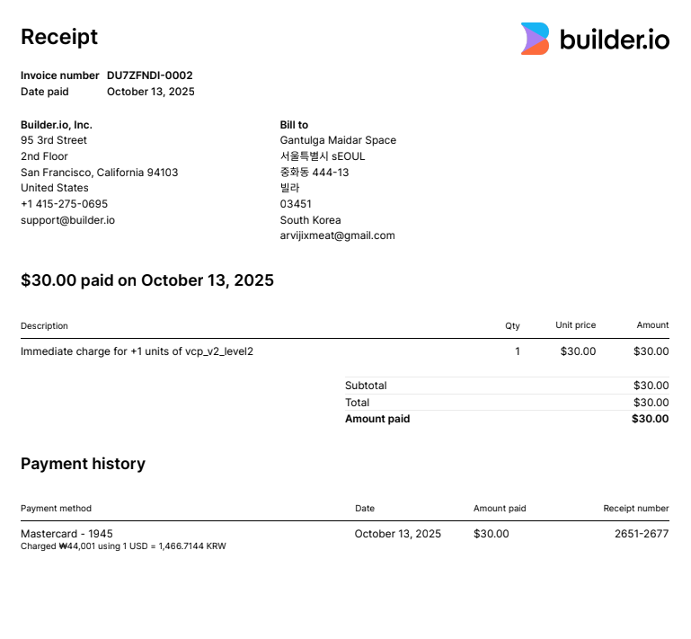 Hi @Gantulga welcome to the Builder forum. The invoice you have attached is for your Pro plan and not the agent credits. I checked your account as well and I don’t see any other payment made for agent credits.